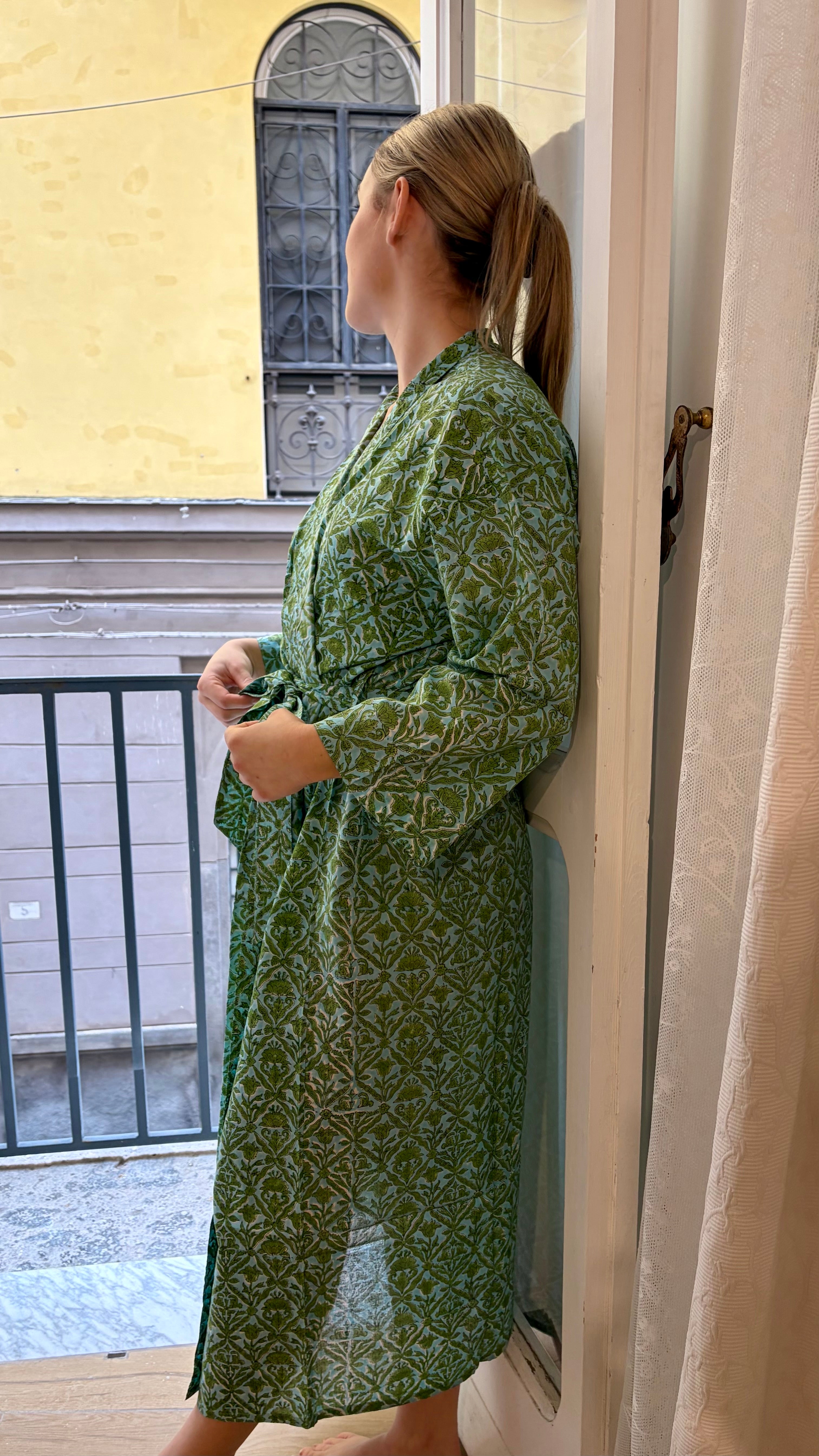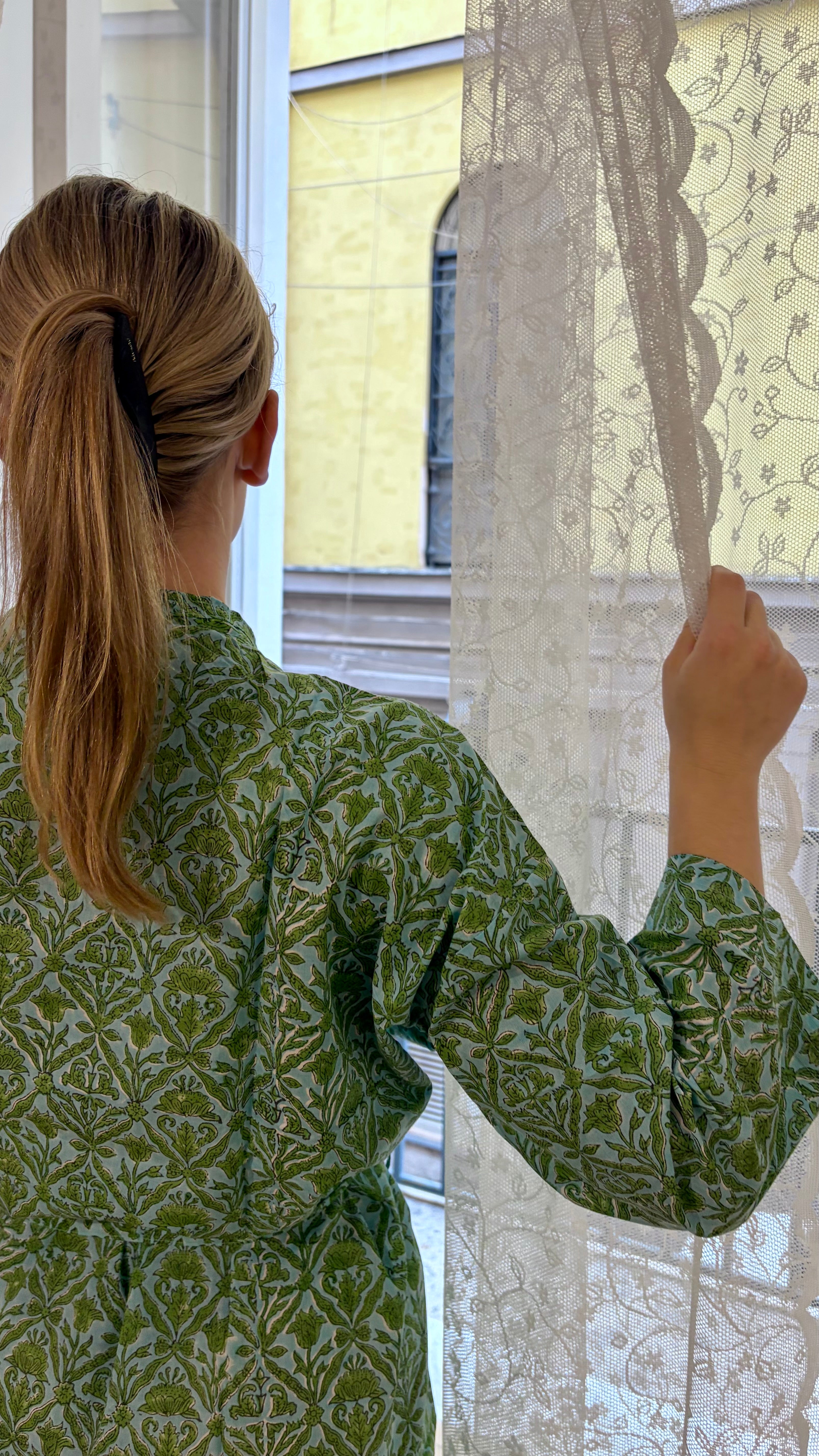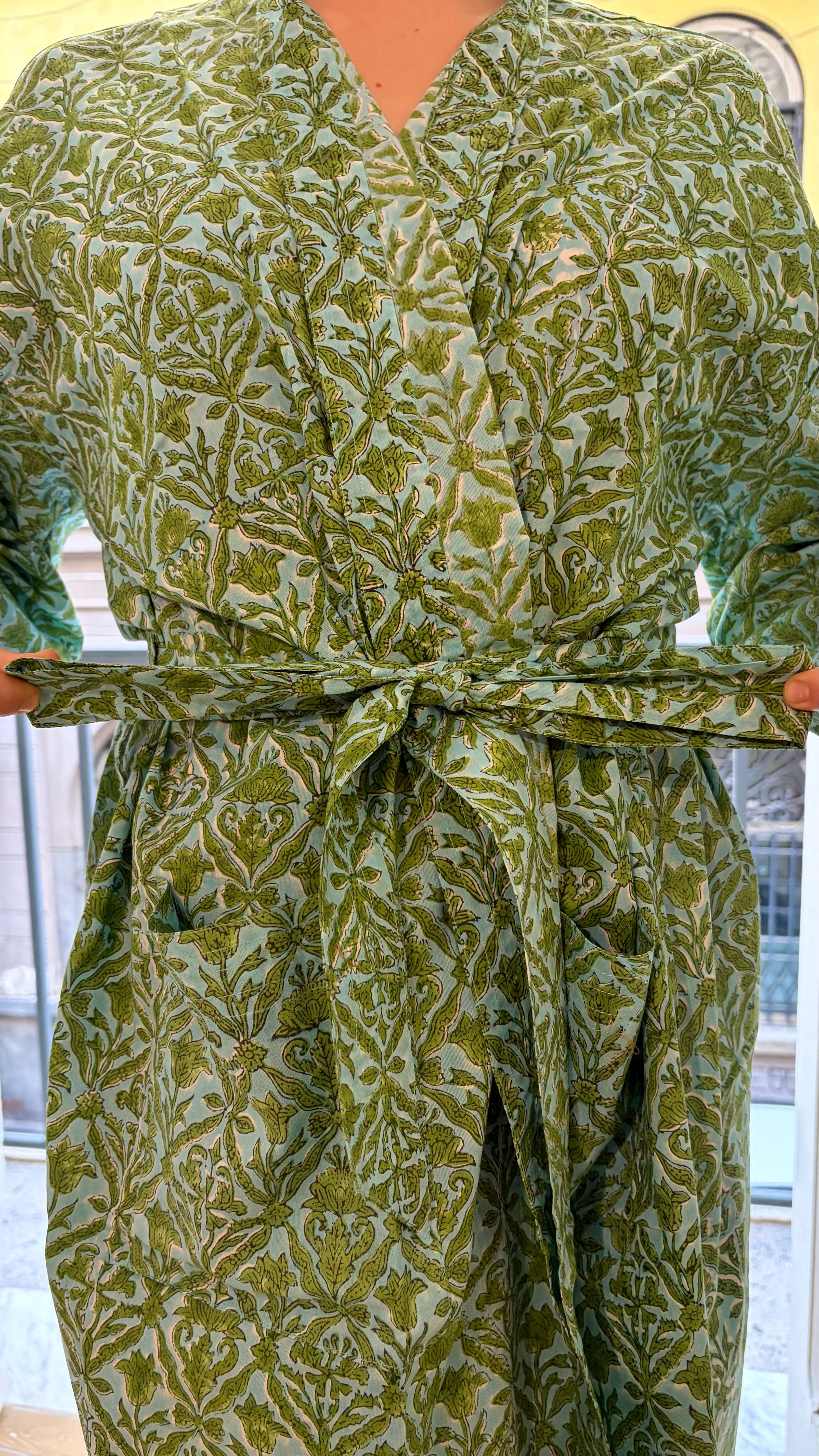 Beautiful 100% cotton kimono robe, perfect for wearing as sleepwear or lounge wear. This robe is created using super lightweight and breathable cotton that becomes softer with every wash. The beautiful print is created using the ancient technique of hand block printing. This technique means each robe is a unique one of a kind piece, and small imperfections may be present.