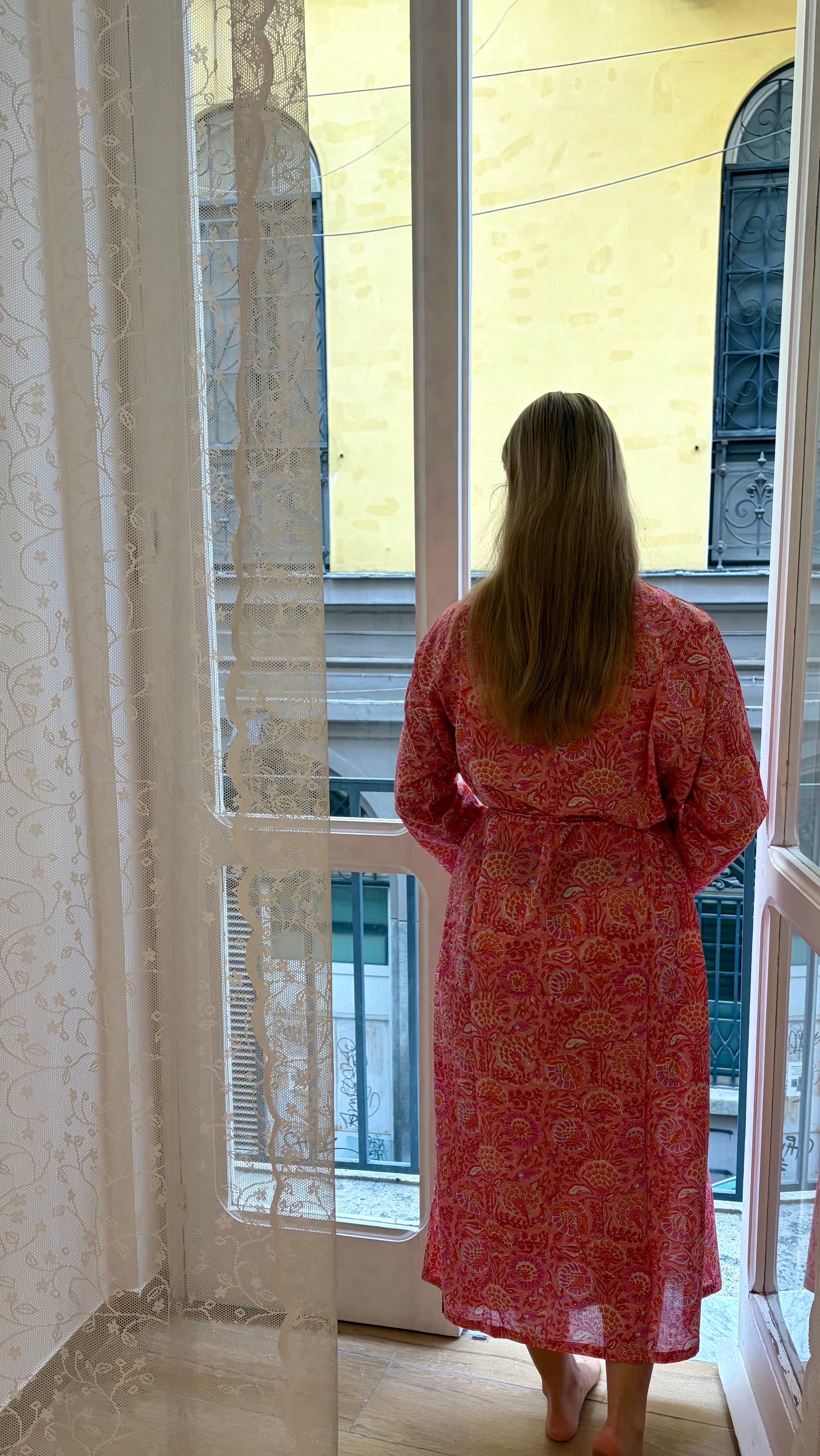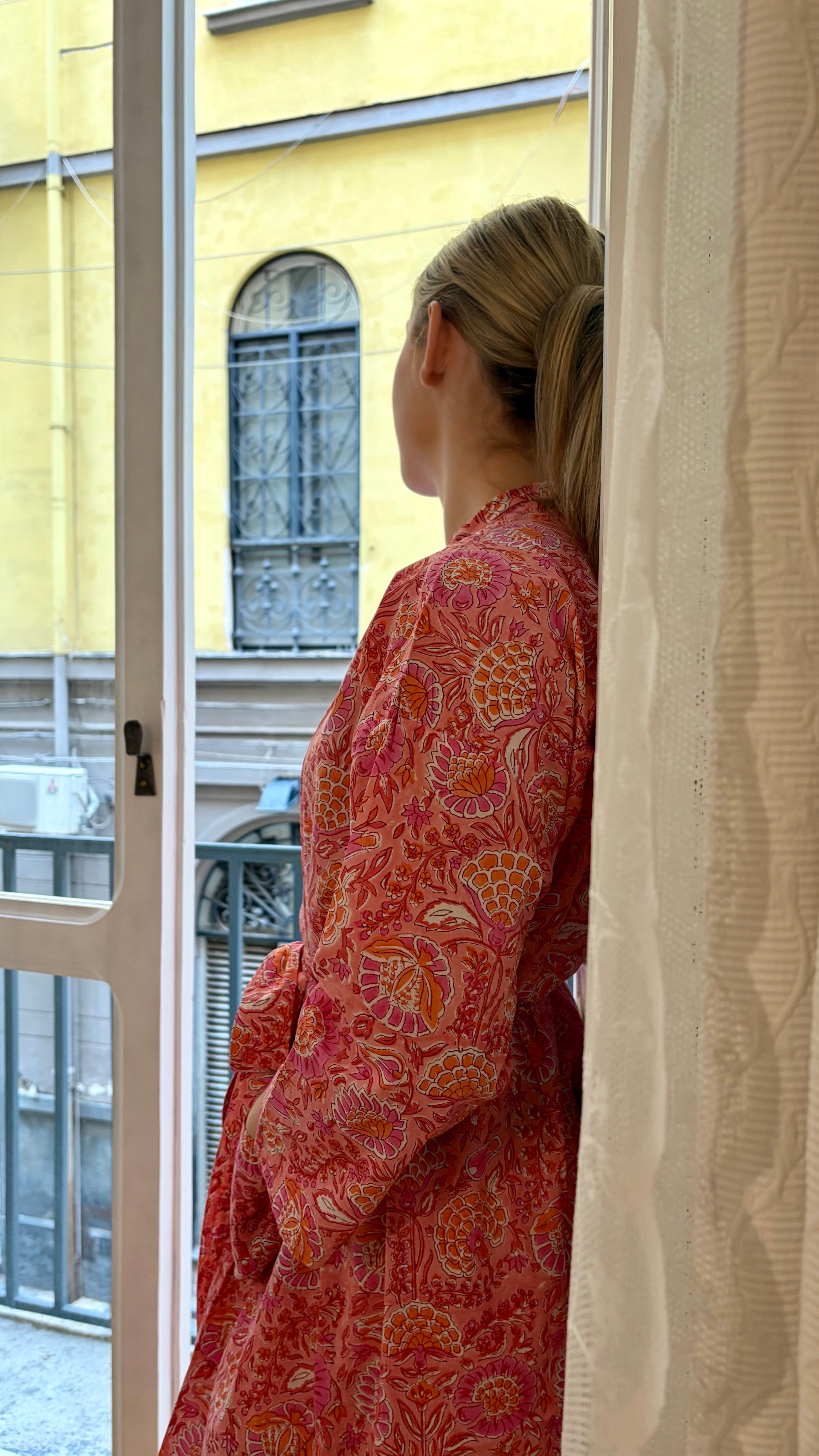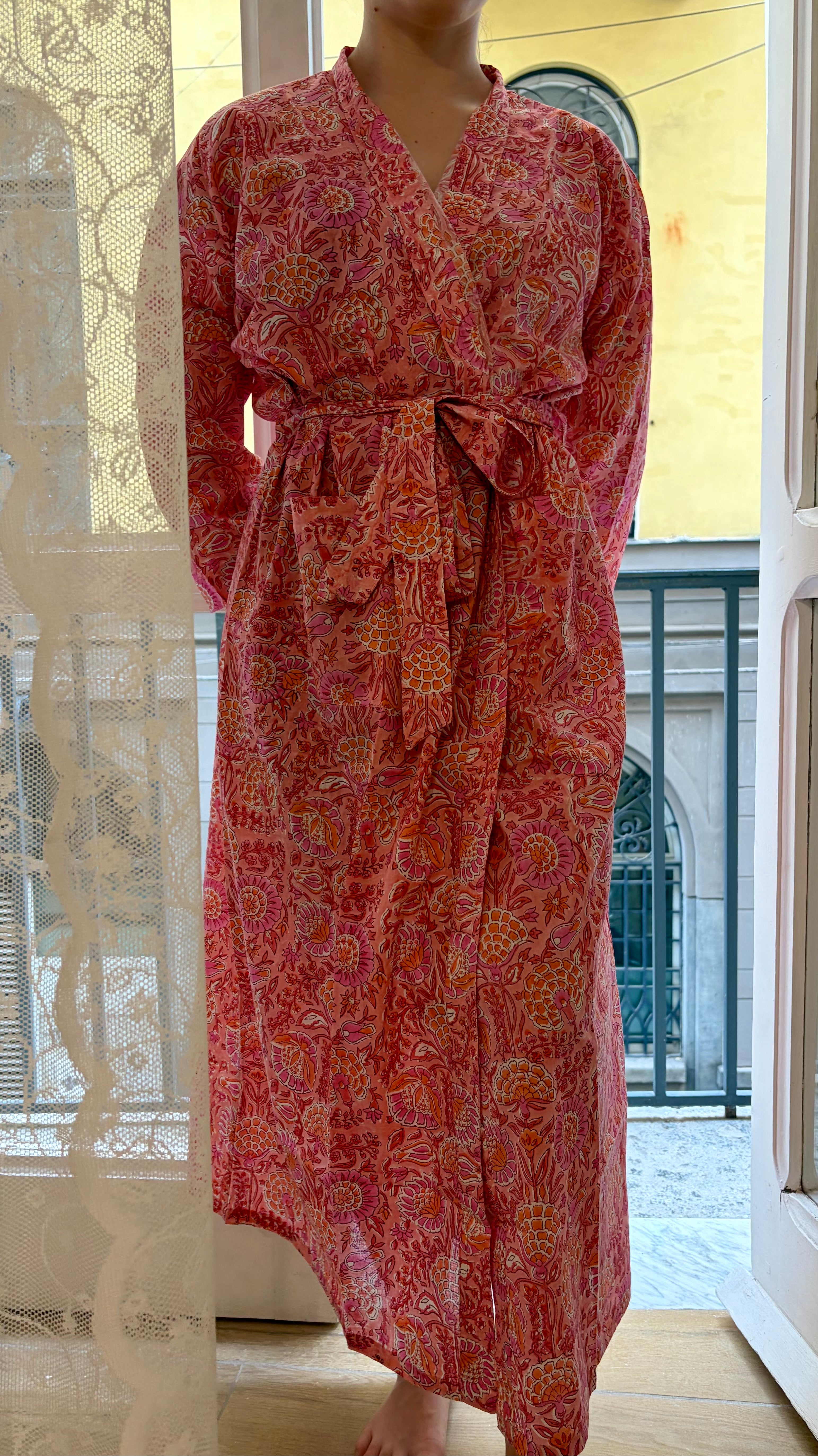 Beautiful 100% cotton kimono robe, perfect for wearing as sleepwear or lounge wear. This robe is created using super lightweight and breathable cotton that becomes softer with every wash. The beautiful print is created using the ancient technique of hand block printing. This technique means each robe is a unique one of a kind piece, and small imperfections may be present.